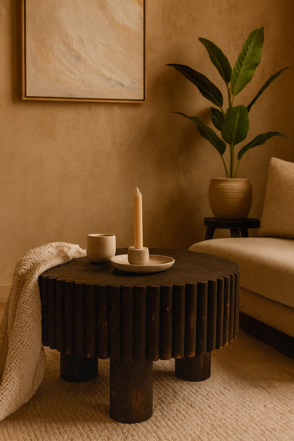 Stoer, sfeervol en net even anders, dat is bijzettafel Nero XL. Met zijn ronde vorm en opvallende lattenstructuur rondom het blad is deze houten tafel een echte blikvanger. De diepe, donkere afwerking geeft hem een warme uitstraling die perfect tot zijn recht komt in een modern, industrieel of eclectisch interieur.