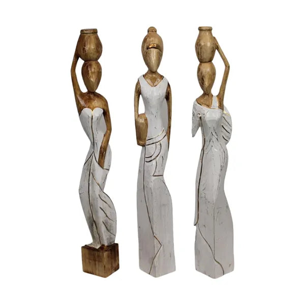 Een ode aan elegantie traditie en vakmanschap Beeldenset Grace bestaat uit drie unieke sculpturen met de hand vervaardigd uit albizia hout De sierlijke vormen zachte lijnen en subtiele whitewash afwerking geven de beelden een verfijnde uitstraling die perfect past in een warm werelds interieur Elke vrouw draagt trots haar kruik en vertelt zonder woorden een verhaal van kracht en gratieMet een hoogte van 78 cm 13 x 10 x 78 cm per stuk zijn het echte showstoppers Op de vloer op een sidetable of in een nis Tijdloos karaktervol en vol betekenis Een stijlvolle toevoeging waar je elke dag opnieuw naar blijft kijken