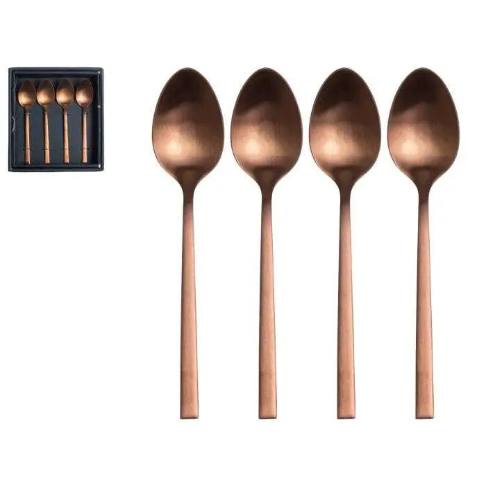Voor een onmiskenbaar stijlvolle touch op een prachtig gedekte tafel zijn deze koperen dessertlepeltjes een must-have. Vervaardigd uit hoogwaardig roestvrijstaal en uitgevoerd in een elegante zwarte kleur, voegt dit bestek niet alleen een verfijnde uitstraling toe aan je tafelsetting, maar garandeert ook langdurige schoonheid en duurzaamheid. De set bevat vier prachtig vormgegeven dessertlepeltjes, perfect voor het serveren van heerlijke dessert na een uitgebreid diner.
