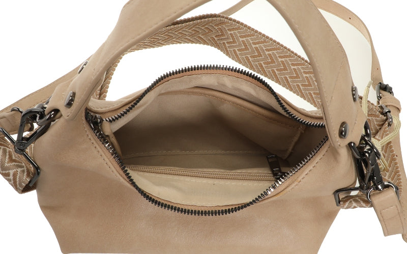 Ondanks dat de tas soepel en compact oogt, past er verrassend veel in het hoofdvak. Binnenin vind je een klein open vakje en een ritsvakje, zodat je je sleutels en telefoon niet hoeft te zoeken tussen je andere spullen. De tas sluit veilig met een rits, zodat je met een gerust hart op pad kunt.
