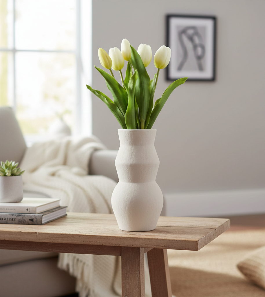 Deze set van 5 witte kunsttulpen van 36 cm geeft je interieur meteen een frisse rustige uitstraling zonder water geven en zonder verwelkte bloemen. De zachte witte kleur past overal bij en zorgt voor een lichte stijlvolle sfeer op tafel in de vensterbank of op een dressoir.