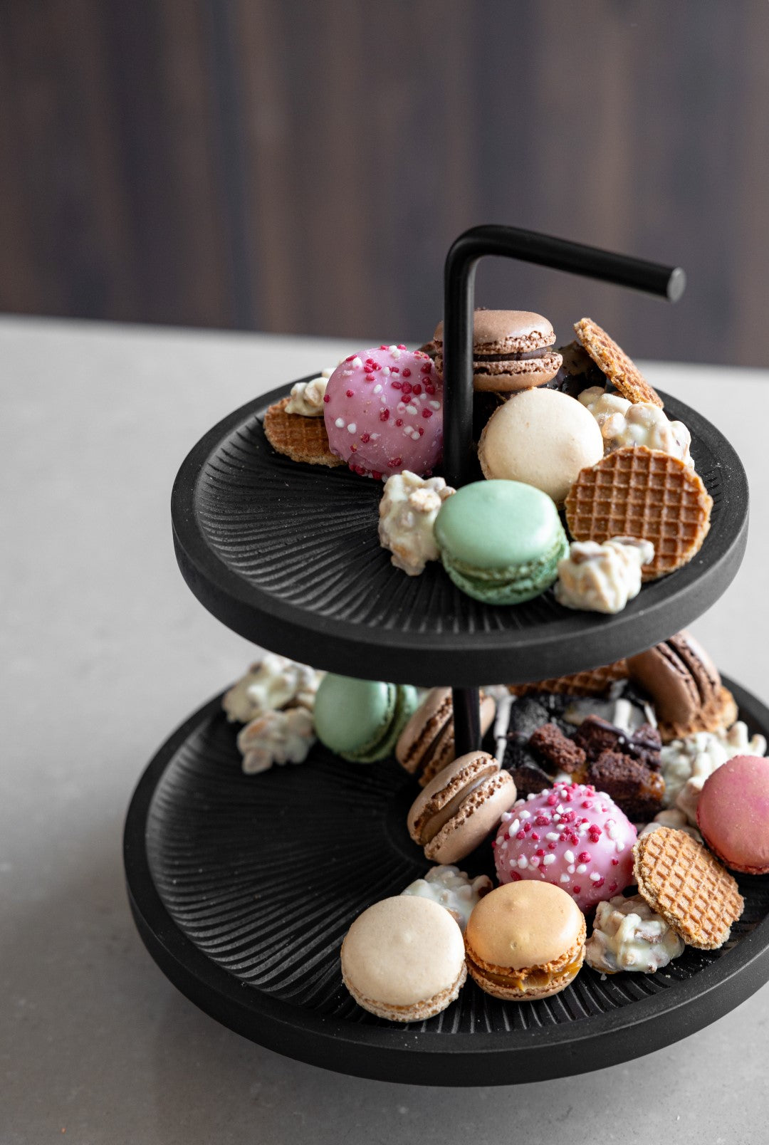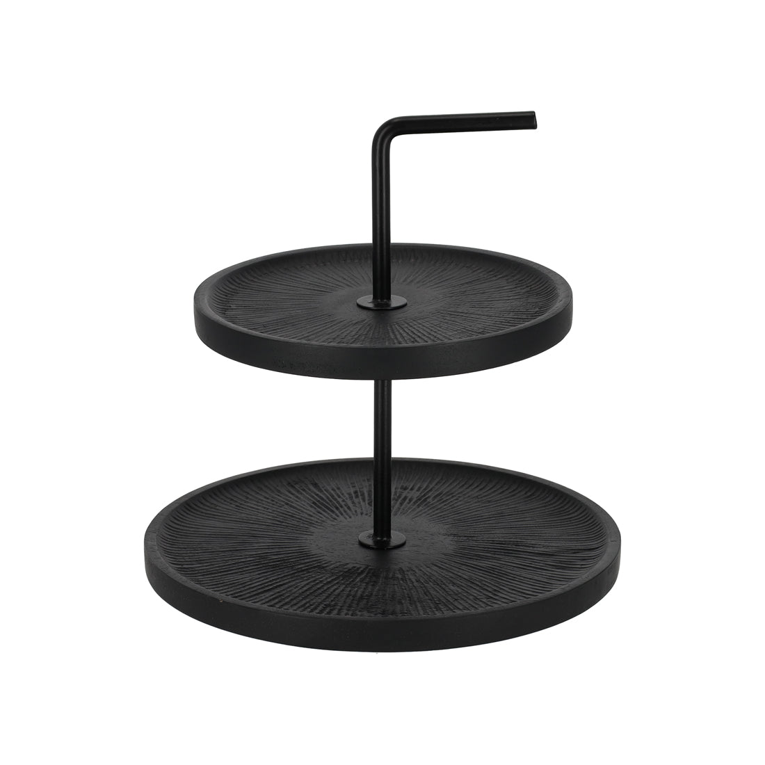 Een stijlvolle etagère die direct sfeer toevoegt aan elke tafel. De twee ronde lagen van mangohout worden elegant verbonden door een metalen tussenstang met een handig handvat aan de bovenkant. Perfect om borrelhapjes op te serveren tijdens een gezellige avond, maar net zo leuk als decoratief accent in je interieur.