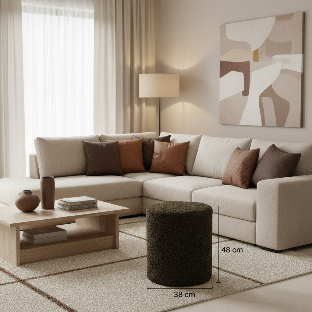 Poef Noa in donkerbruin bouclé straalt warmte en comfort uit. De zachte, volle stof met haar herkenbare lusstructuur geeft deze poef een moderne en knusse uitstraling. Perfect voor wie houdt van een sfeervol interieur met natuurlijke materialen en rijke texturen.
