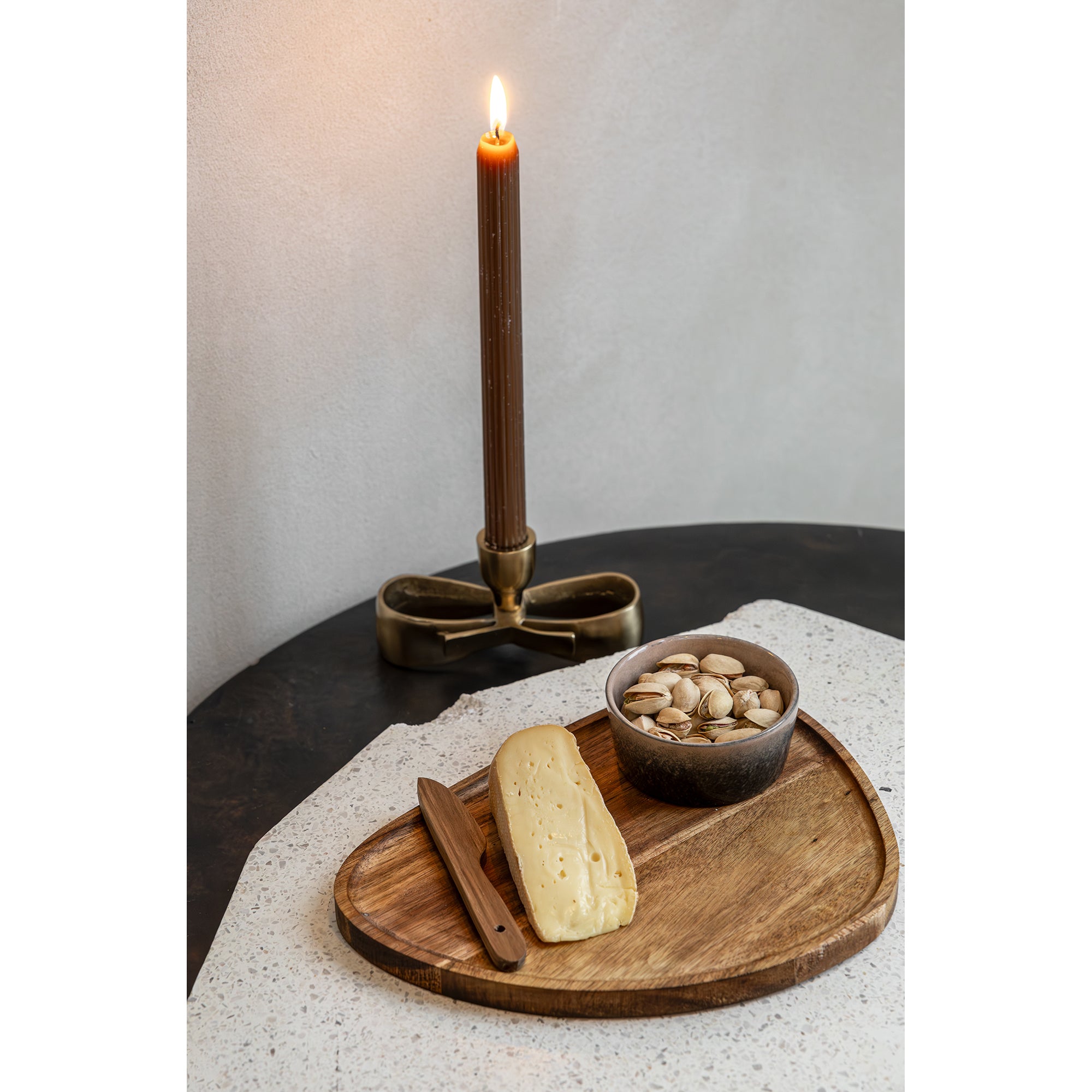 Deze leuke serveerset is gemaakt voor de kleine genietmomenten. De set bestaat uit een acaciahouten serveerplank, een schaaltje en een bijpassend acaciahouten mes. Het schaaltje valt direct op door het reactieve glazuur, waardoor iedere kom net even anders is. De subtiele kleurschakeringen geven de set een unieke en warme uitstraling die mooi staat op elke gedekte tafel.