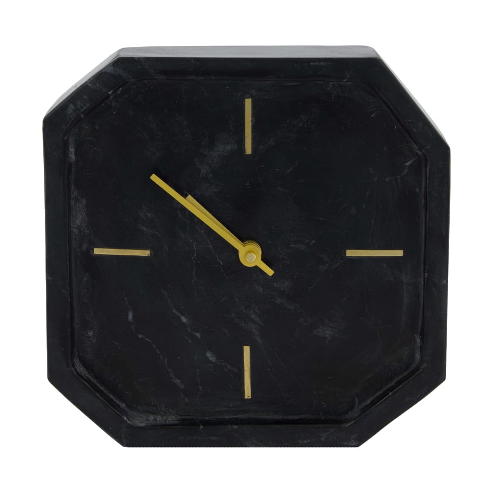 De Tafelklok Marmora Zwart brengt luxe en karakter in huis met zijn stoere marmerlook. Gemaakt van keramiek met een zwart marmerdesign, waardoor elke klok een unieke uitstraling heeft. De goudkleurige wijzers en uurmarkeringen geven een chique contrast en maken deze klok tot een opvallend statement in je interieur.