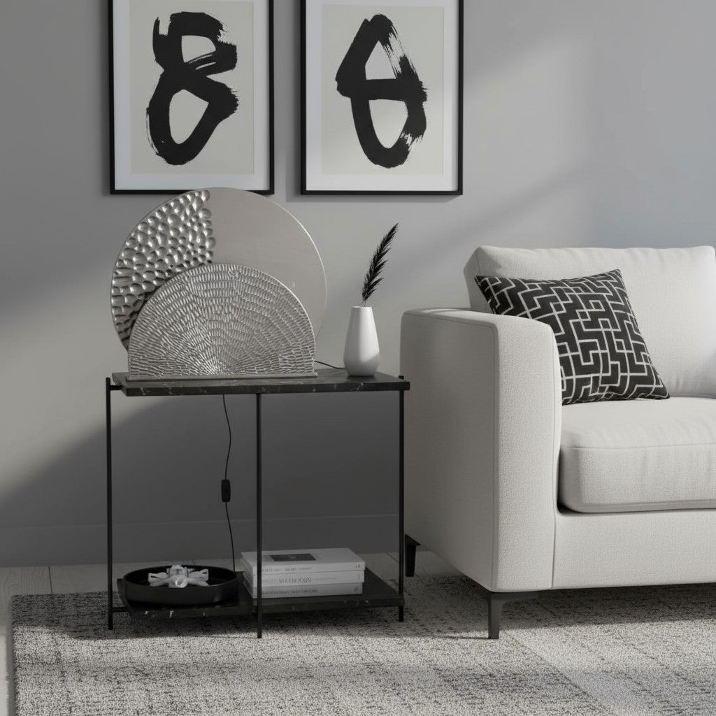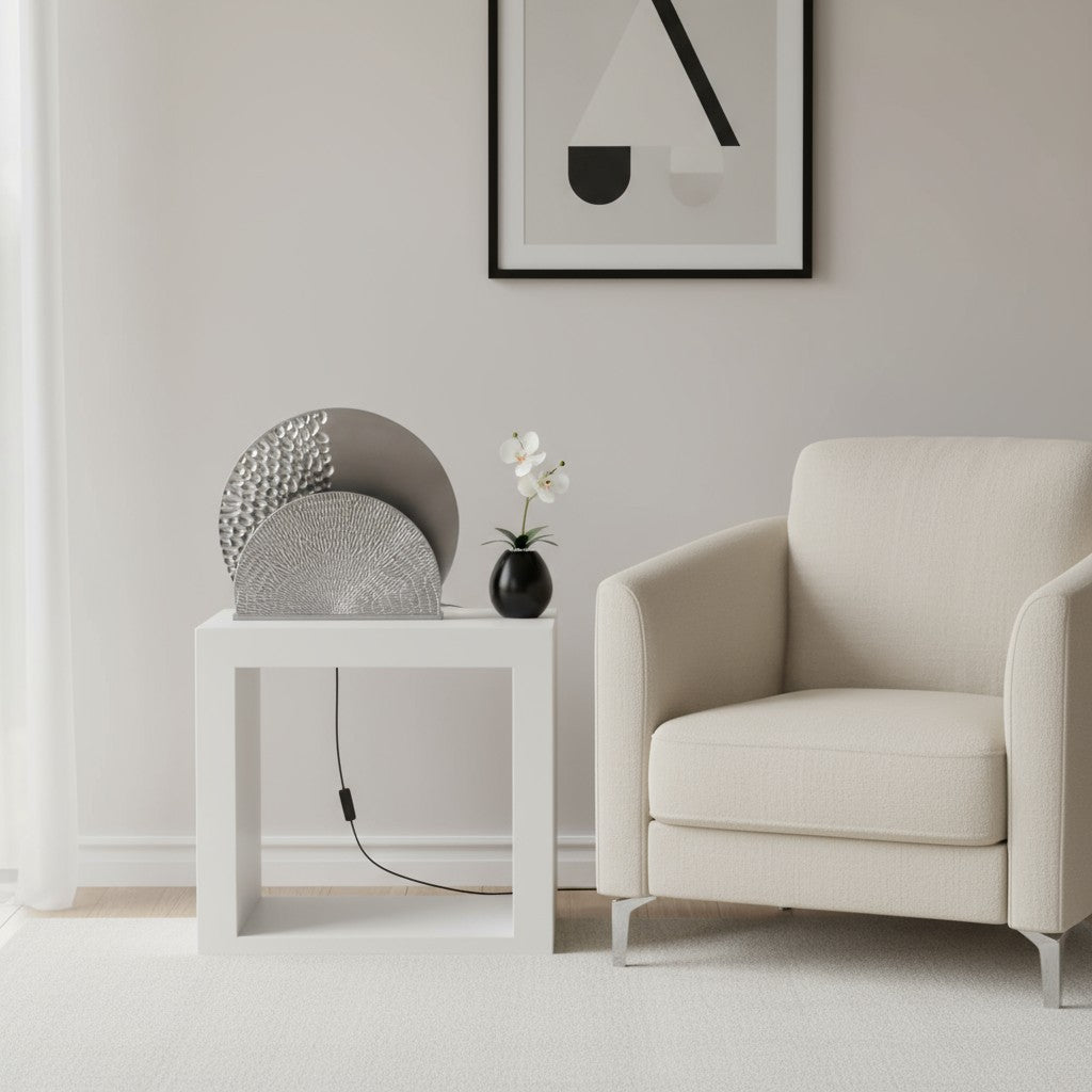 De tafellamp Luna heeft een opvallend design dat meteen de aandacht trekt. De ronde metalen vorm met reliëf geeft een speels lijnenspel dat prachtig wordt benadrukt wanneer het licht aangaat. De zilverkleurige afwerking zorgt voor een luxe, moderne uitstraling en laat de lamp schitteren in elk interieur.