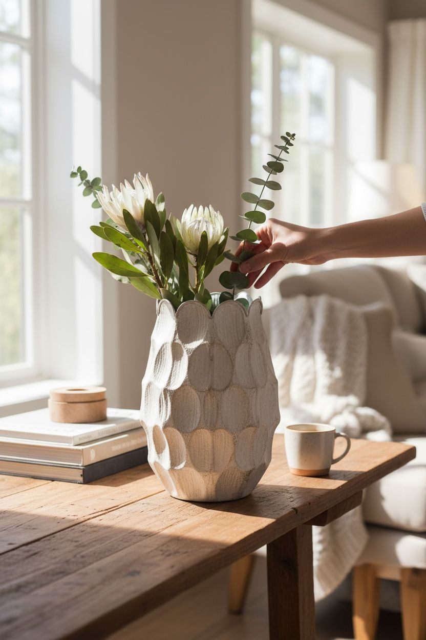 Perfect voor een paar decoratieve takken, een bos droogbloemen of gewoon als object op zichzelf. De matte finish en organische details zorgen voor een natuurlijke look die past bij landelijke, romantische of Scandinavische woonstijlen.