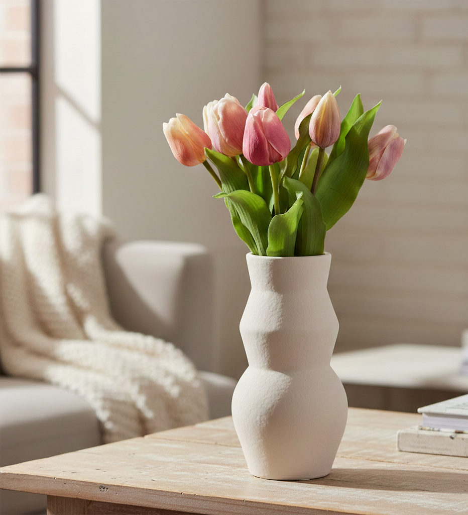Deze porseleinen vaas heeft een elegante golvende vorm die meteen opvalt, zonder schreeuwerig te zijn. De zachte off white kleur geeft een rustige basis en past moeiteloos bij verschillende woonstijlen, van Scandinavisch en modern tot warm en landelijk.